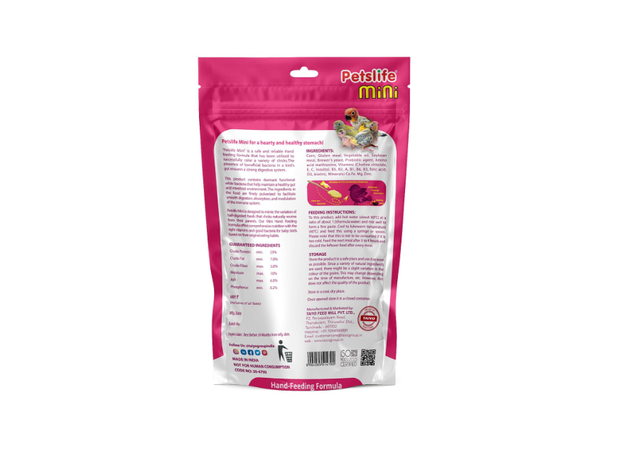 Pets-life mini hand feeding formula is a specialized product designed for hand-rearing small baby animals, including young birds and other small pets. Ideal for situations where animals are orphaned, abandoned, or unable to be fed by their parents, this formula ensures they receive the essential nutrition they need.