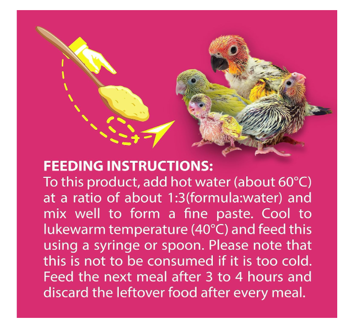 - Complete natural nutrition: formulated for easy digestion, supporting the metabolic rate of young small-breed baby birds.