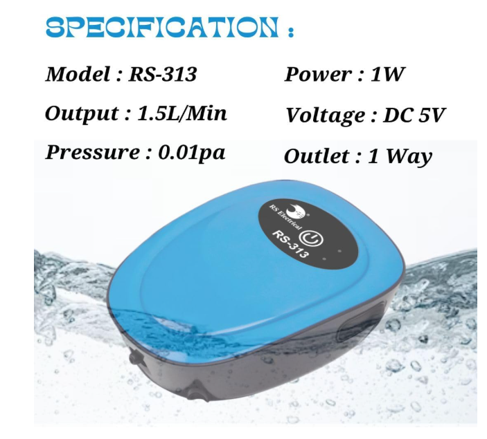 This versatile aquarium pump doubles as a fish aquarium oxygen motor pump, perfect for both freshwater and marine tanks. It includes an airtube and airstone, making it a complete aquarium air pump with filter accessories. Whether you need an aquarium water pump, aquarium filter pump, aquarium top filter pump, or a mini aquarium oxygen pump, the RS-313 delivers efficient aeration and quiet operation.