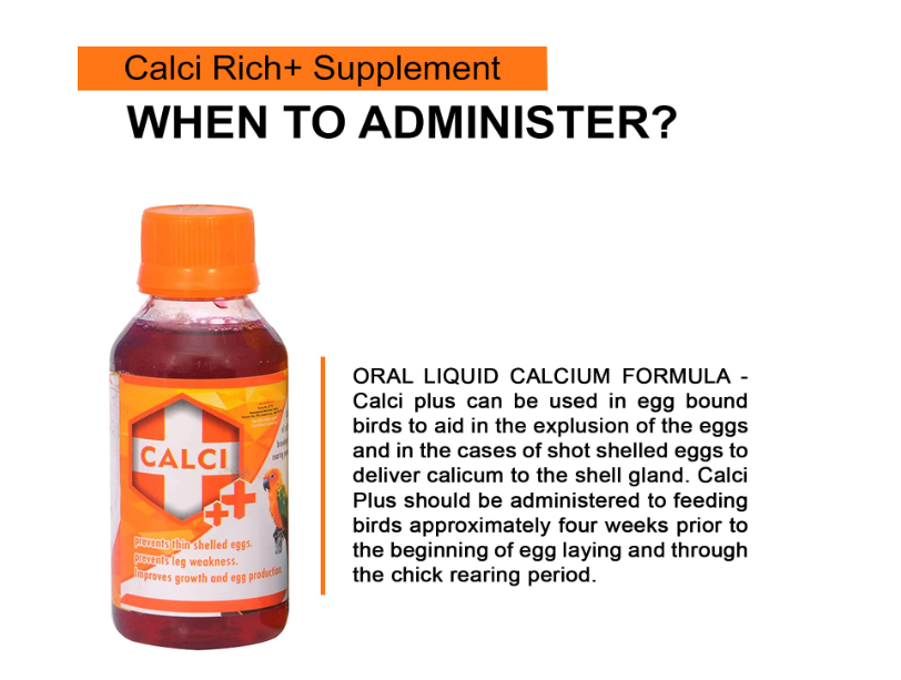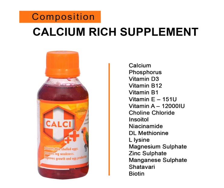 Star Farms Calci Plus+ is a premium liquid calcium supplement formulated for birds. It supports healthy growth, strengthens bones and legs, and enhances egg production in both pet and farm birds. This supplement helps prevent thin-shelled eggs and egg-binding, ensuring your birds stay active, healthy, and productive.