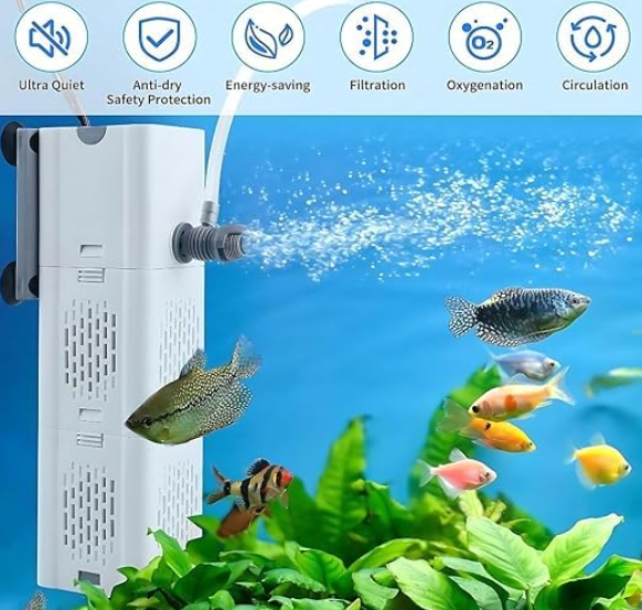 The Aquarium Internal Filter is a compact, submersible fish tank filter pump designed to keep your aquarium water filter clean, clear, and healthy for your aquatic life. This fish filter pump efficiently removes debris, excess food, fish waste, and harmful toxins using a combination of mechanical, biological, and chemical filtration.